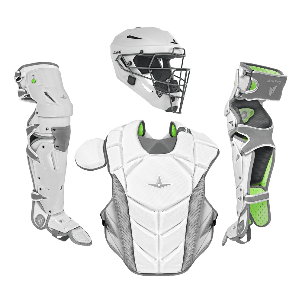 The game is changing. Catchers must adapt and so should their gear. Pitchers are throwing harder with more movement. The wild pitches are getting wilder (not to mention the backswing). Catcher equipment must provide confidence to react without question or distraction. Unrestrained, secure, and of course protected. The MVP-Pro catcher's set is All-Star's sign to the baseball world that we have entered a new era in catching.