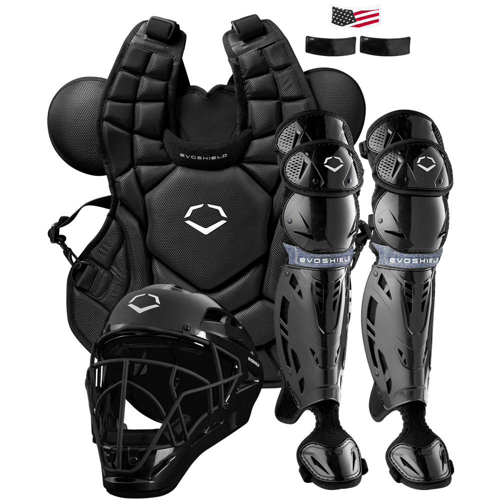Playing backstop is serious business. That's why the EvoShield Baseball Catcher's Gear Kit equips you with head-to-toe protection to stay safe all season. Made for baseball players of every skill level, this kit includes our SRZ-1 Solid Catcher's Helmet, SRZ-1 Catcher's Upper and Lower Leg Guards, and a chest protector that is certified by SEI to the NOCSAE standard for Commotio Cordis for all levels of play. Our catcher's helmet features a padding system with moisture-wicking fabric to optimize comfort and a steel facemask designed to keep your eye on the ball. The chest protector comes with two extra pieces of black hook-and-loop fabric that you can embroider for a customized look and a third piece of hook-and-loop fabric that features a USA flag. The two-piece leg guard system can be adjusted up or down by two inches, and the lower leg guards are made of our Gel-to-Shell Technology that molds to you like a glove and disperses impact energy.