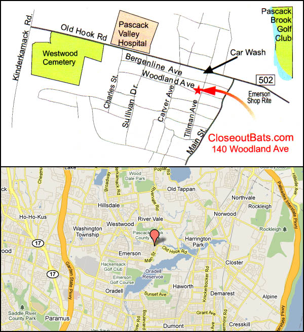 Take Route 17 North Take 17 north through Paramus. As you pass McDonald's you will see an exit "Linwood Ave -- East." Take the following exit, "Washington, Hillsdale, Westwood." This will put you on Van Emburg Avenue. Continue on Van Emburg to the second traffic light (which is a blinking light) and make a right onto Washington Avenue (Route 502). Continue on Washington through the next 3 traffic lights. Go over the railroad tracks. At the fourth traffic light make a right turn onto Old Hook Rd. Continue for 0.8 miles. At the traffic light by Pascack Valley Hospital, turn right onto Charles Street. Make second left onto Woodland Ave. CloseoutBats is 0.4 miles down on the left-hand side.Take Garden State Parkway NorthTake exit #168. Make a right at the end of the exit ramp. You will be on Washington Avenue (Route 502). Continue on Washington through the next 3 traffic lights. Go over the railroad tracks. At the fourth traffic light make a right turn onto Old Hook Rd. Continue for 0.8 miles. At the traffic light by Pascack Valley Hospital, turn right onto Charles Street. Make second left onto Woodland Ave. CloseoutBats is 0.4 miles down on the left-hand side.