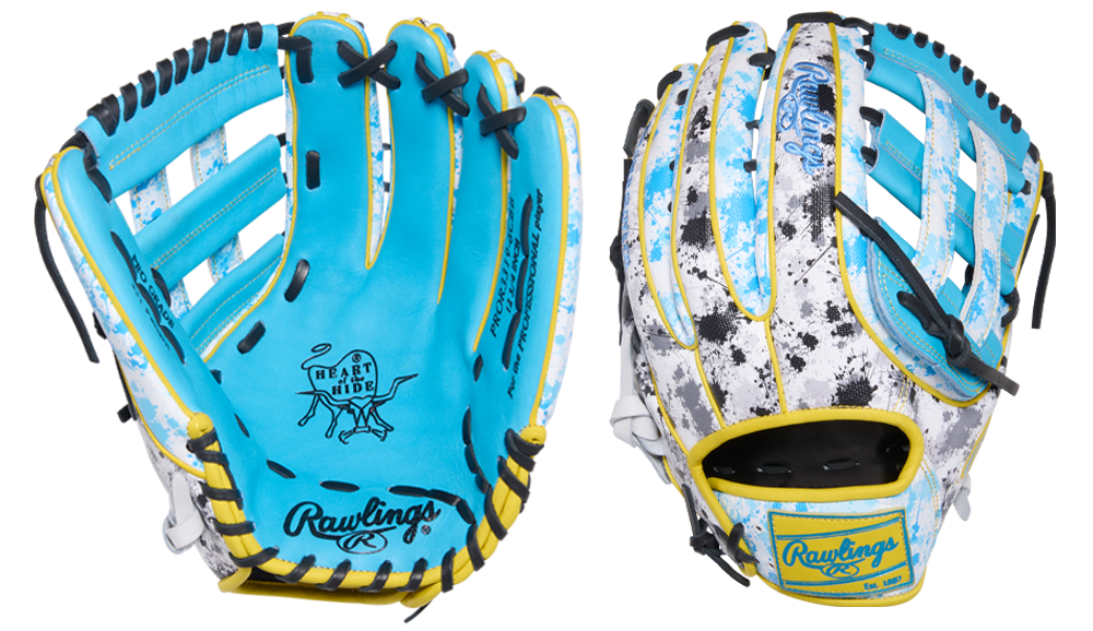 Rawlings Heart of the Hide Color Sync 10 Splatter 12.75" Glove brings bold, high-energy style to the outfield with a design that’s built to stand out on every play. Featuring a vibrant Columbia blue shell with yellow accents, this glove delivers a bright, confident look that pops against the grass. What sets this glove apart is its splatter design across the back, adding a unique, unpredictable pattern that gives each detail a raw, energetic feel. The contrast between the clean base colors and the black and white splatter creates a dynamic look that feels both aggressive and modern. Built for the outfield, this glove features 3319 pattern with a Pro-H web, giving you extended reach and a deep, secure pocket for tracking down fly balls and making plays with confidence. The added length helps you cover more ground while maintaining control on every catch. Crafted from Rawlings’ world-renowned Heart of the Hide leather, this glove delivers pro-level durability and structure, forming the perfect pocket over time. It’s the same trusted material used by elite players, giving you consistent feel and performance every time you take the field.