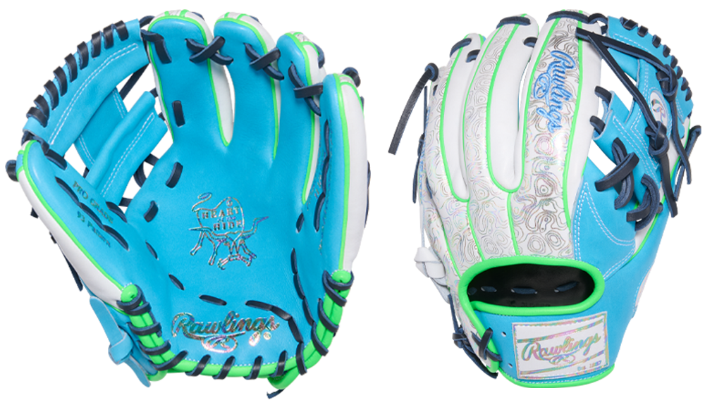 Rawlings Heart of the Hide Color Sync 10 GeoPrint 11.5" Glove brings a futuristic edge to the field with a bold mix of metallic texture and vibrant color. Featuring a bright teal shell with black laces and striking green accents, this glove delivers a clean, high-contrast look built to stand out from every angle. What sets this glove apart is its metallic silver geoprint detailing across the back, adding a sleek, reflective finish with intricate pattern work that gives it a modern, precision-driven feel. The combination of smooth leather and detailed print creates a layered design that feels both premium and dynamic. Built for infield performance, this glove features 934 pattern with a Pro-I web, offering a shallow, responsive pocket ideal for quick transfers and smooth control. Whether you're turning two or making plays on the move, this glove is designed to keep your hands quick and consistent. Crafted from Rawlings’ world-renowned Heart of the Hide leather, this glove delivers pro-level durability and structure, forming the perfect pocket over time. It’s the same trusted material used by elite players, giving you reliable feel and performance every time you take the field.