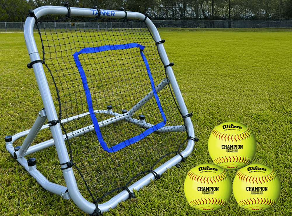Enhance your softball training with Tanner's versatile 3' x 3' Adjustable Rebounder Net. Includes 3 Wilson ASA Championship 11" synthetic softballs.