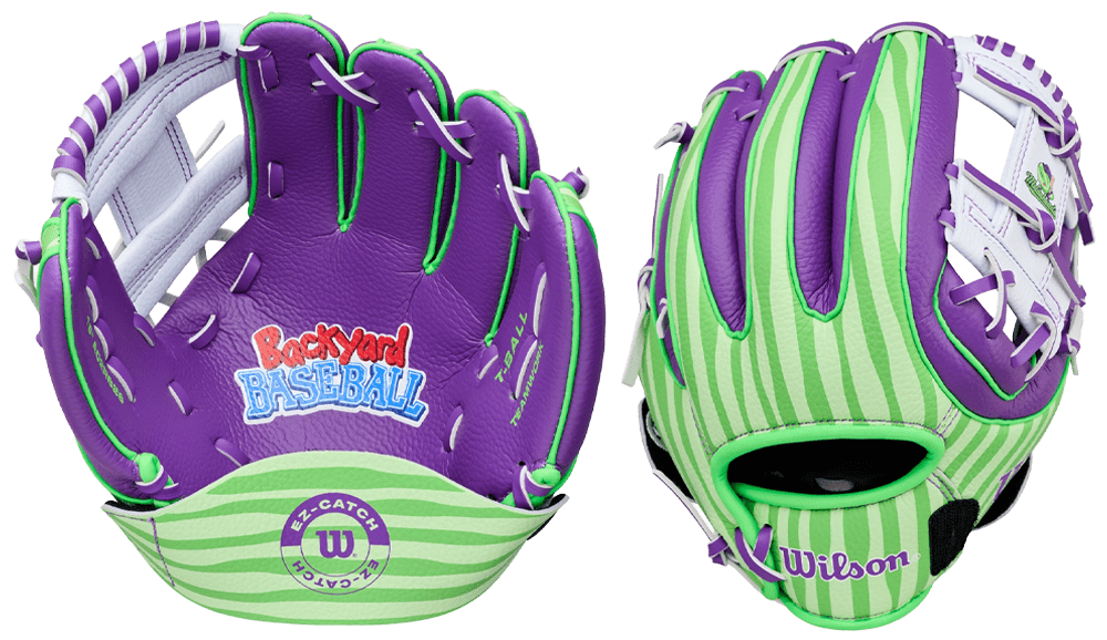 Gear up like your favorite Backyard Baseball team with the A200 EZ Catch Backyard Baseball Melonheads 10” T-Ball Glove, built for your young player to earn their spot on the squad. A Melonheads logo appears on the H-Web while a Backyard Baseball wordmark is printed in the palm. Featuring a purple & green design and a catch assist strap, this glove helps players learn the fielding basics.