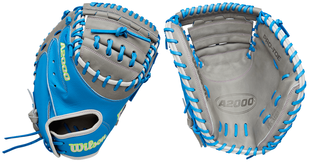 Set up the perfect target behind home plate with the Fall 2025 A2000 FPCM23SS, a fastpitch softball catcher’s mitt designed with thinner toe pads and a larger palm for easier receiving. Grey Pro Stock leather across the extended palm and Horizontal Hinge Web helps catchers corral high rise balls or low drop balls on the edges of the zone. Sky Blue SuperSkin across the back of the glove repels moisture to keep the mitt lightweight so catchers can hold steady and an adjustable drawstring closure allows for easy adjustments on the fly.
