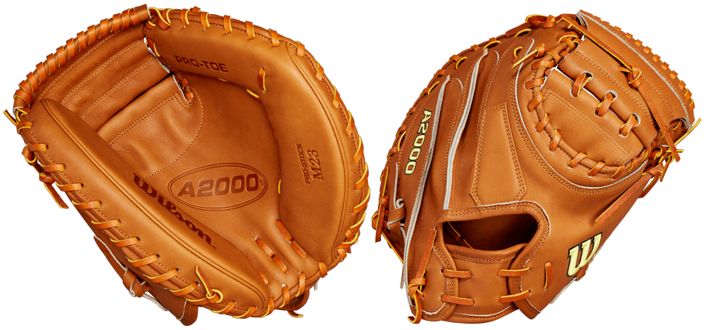 The Glove Day Series A2000 M23, a 33.5" catcher’s mitt designed for modern players focused on "thumb-up" catching and pitch framing, uses thinner toe pads on the thumb and fingers to create a wider catching area. The full Pro Stock leather construction delivers a premium feel and timeless appearance.