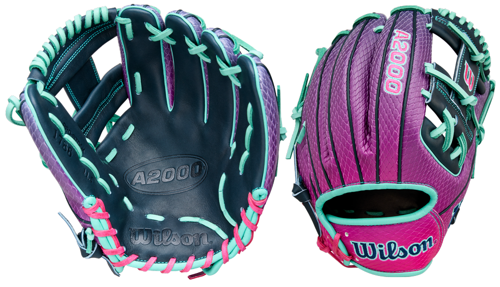 Fresh off the vine, the 2025 Grape Flamingo A2000 1786SS checks in at 11.5 with Purple & Flamingo Pink gradient SuperSnakeSkin to make juicy plays at second base, third base or shortstop. The multi-colored SuperSnakeSkin keeps the glove lightweight while infielders turn double plays or make diving stops in the hole. This gloves I-Web construction and shallow pocket design offers total control to quickly transfer the ball and get outs at any base. The Navy Blue Pro Stock leather palm and Seafoam laces deliver an aquatic appearance and long-lasting performance.