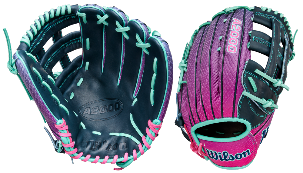 Fresh off the vine, the 2025 Grape Flamingo A2000 1750SS outfield glove features crisp Purple and Flamingo Pink gradient SuperSnakeSkin and a 12.5" reach to pluck fly balls out of the air. The multi-colored gradient SuperSnakeSkin reduces glove weight while outfielders extend for sinking line drives across the grass or reach for home run robberies at the wall. This glove offers more control in the outfield while a sturdy Dual Post Web holds its shape even on diving attempts to get the out. The Navy Blue Pro Stock leather palm and Seafoam laces deliver an aquatic appearance and long-lasting performance.
