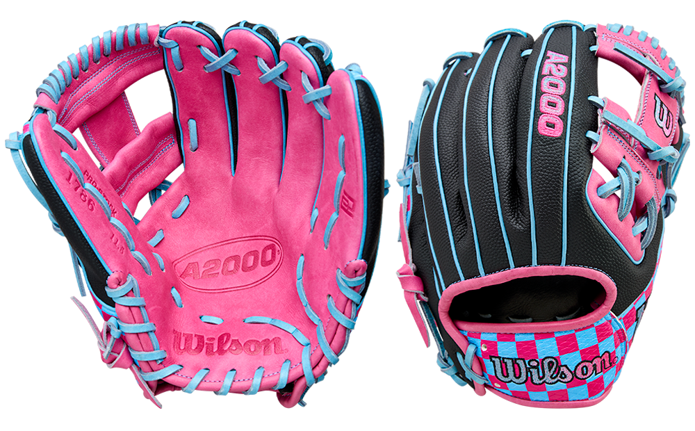 The Wilson 2025 Pottstown Checkerboard A2000® 1786SS, an 11.5” baseball glove with Pottstown’s signature Pink & Sky Blue style to match your highlight-reel production at second base, third base and shortstop. SuperSnakeSkin™ across the thumb, wrist and pinky features a Pink & Blue checkerboard print. The glove’s shallow pocket design, H-Web construction and Pink Pro Stock® leather help infielders quickly get outs while creating viral moments with their defense.