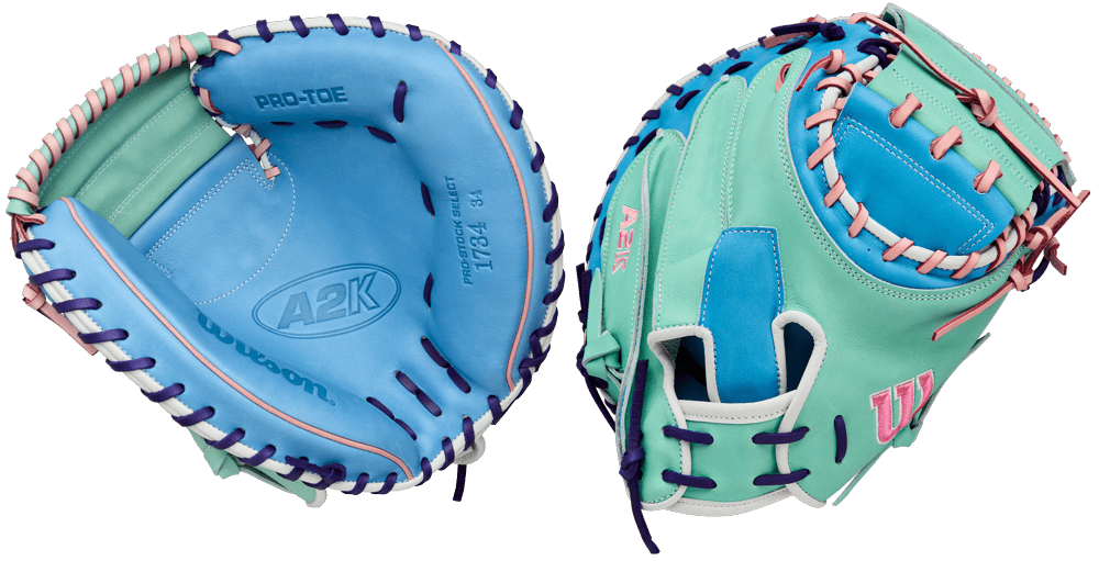Take control of the game from behind home plate with the Fall 2025 A2K 1734, a 34” catcher’s mitt model designed with thinner toe pads along the fingers for easier receiving and accurate framing on the edges of the strike zone. Seafoam Pro Stock Select leather across the back and an extended index finger pad improves comfort. Expert craftsmen in Japan form the A2K with a flawless Sky Blue Pro Stock Select leather palm, and the larger pocket and Half Moon Web secure fastballs or help reel in breaking balls in the dirt.