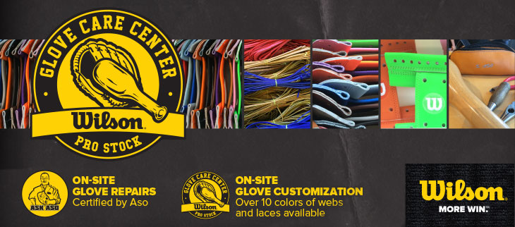 CloseoutBats.com is an official Wilson Pro Stock Glove Care Center. Our glove repair experts are certified by Shigeaki Aso, the Wilson Glove Master Craftsman, to repair your gloves and customize them on-site. We can customize your current Wilson Pro Stock glove -- or a new glove -- with exclusive Wilson Pro Stock webs and lace!